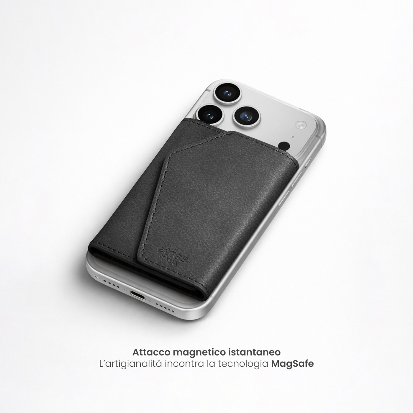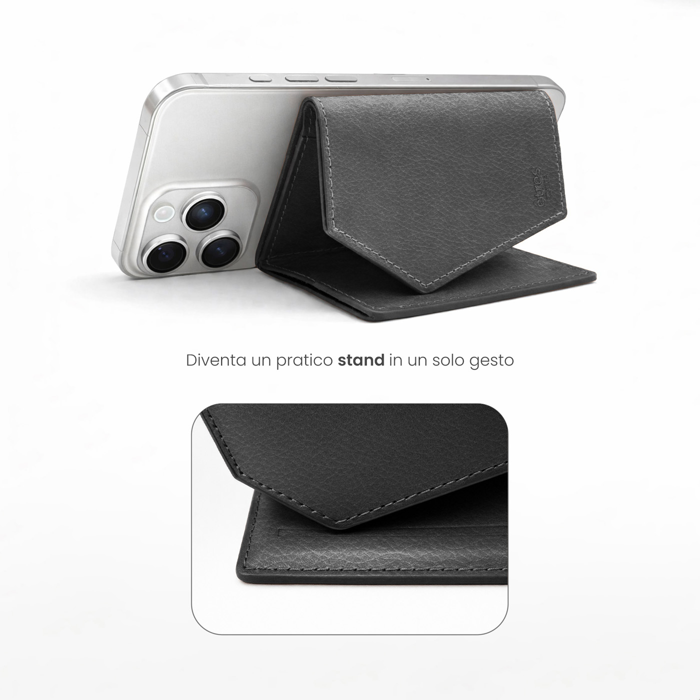 Un classico rivisitato per l'uomo contemporaneo. Il Roma Natural di Êtres si applica magneticamente al retro del telefono con un semplice gesto, adattandosi a qualsiasi dispositivo grazie all'accessorio in dotazione.