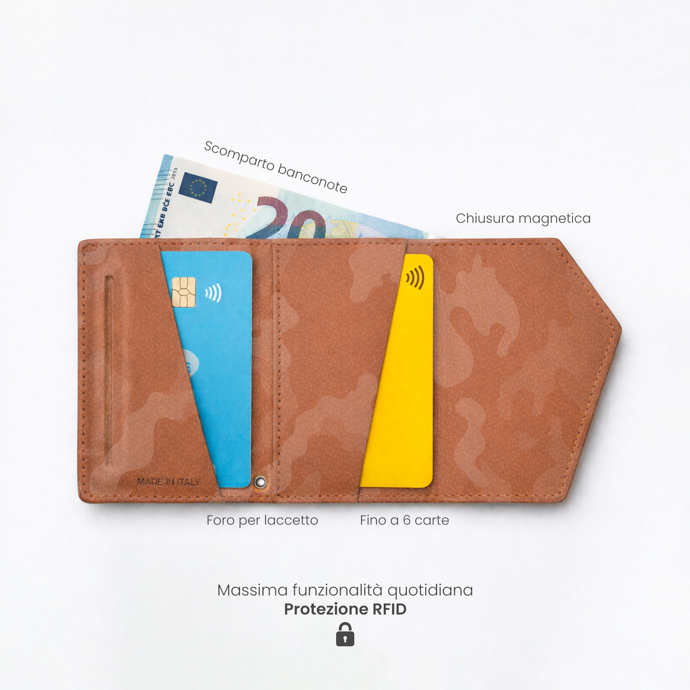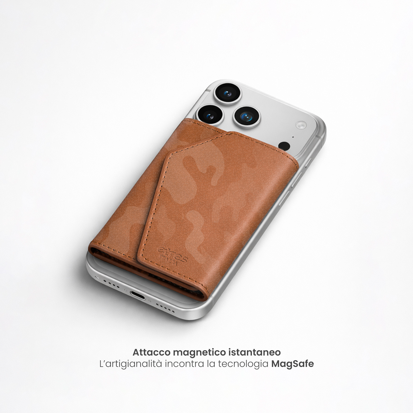 Un classico rivisitato per l'uomo contemporaneo. Il Roma Camouflage di Êtres si applica magneticamente al retro del telefono con un semplice gesto, adattandosi a qualsiasi dispositivo grazie all'accessorio in dotazione.